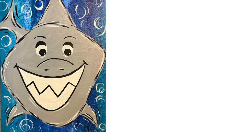 Meet Bruce.  Bruce is one cool dude with a great big smile!  Bruce is inspired by the movie "Finding Nemo". He is a great white shark who leads a support group for sharks trying to quit eating fish, with the motto "fish are friends, not food".  This is a fun painting that even our youngest artists will enjoy creating.